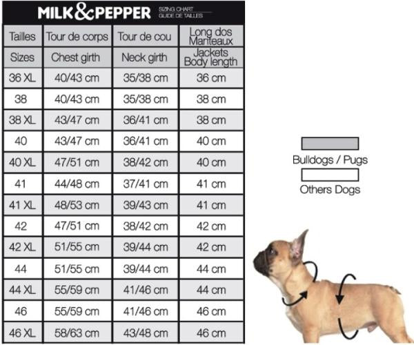 Die Größen mit der Markierung „XL“ sind speziell für Hunde mit breiter Brust entwickelt – ideal für Möpse, French Bulldogs oder ähnliche Rassen. Trotzdem ist der Mantel auch für viele andere kleine bis mittelgroße Hunde geeignet.